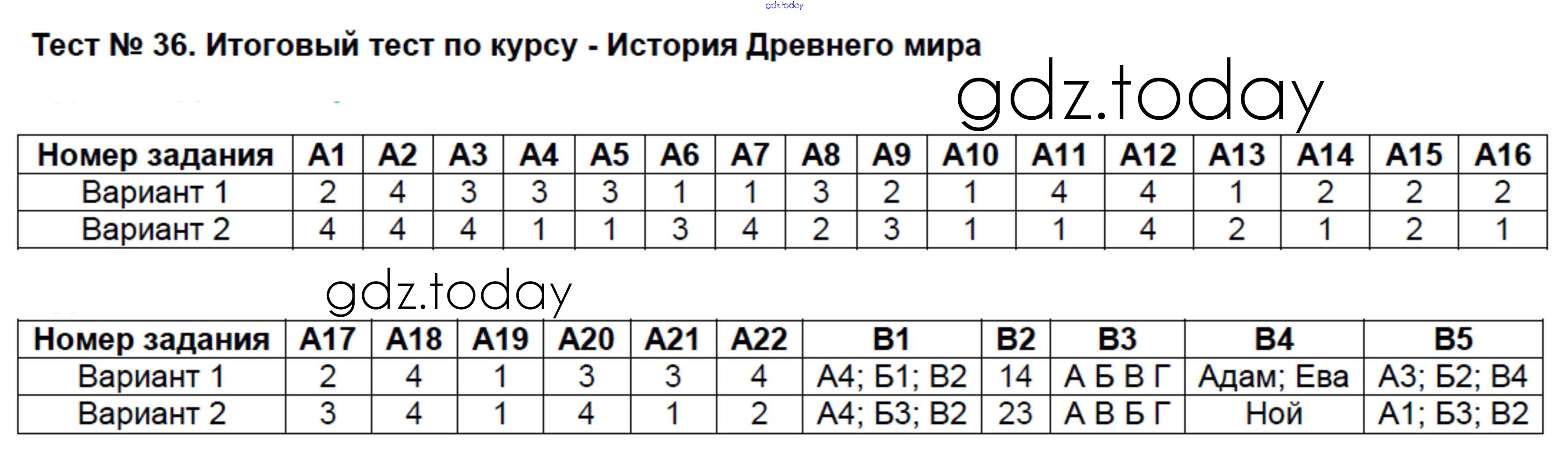 На страницах сайта gdz.today вы найдете учебный и вспомогательный материал, направленный на улучшения знаний школьной программы. ГДЗ - онлайн мир знаний Решение к тестам  Тест №36. Итоговый тест по курсу - История Древнего мира Контрольно-измерительным материалам (КИМ) по Истории для 5 класса Волкова  ВАКО  2017
