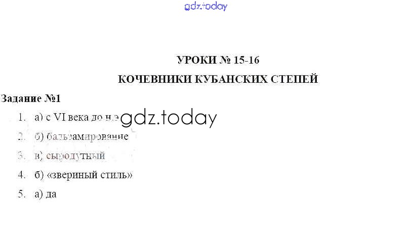На страницах сайта gdz.today вы найдете учебный и вспомогательный материал, направленный на улучшения знаний школьной программы. ГДЗ - онлайн мир знаний Решение к урокам № 15-16. Кочевники кубанских степей 1 Рабочей тетради по Кубановедению для 5 класса Трехбратов Традиция 2019