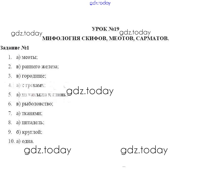 На страницах сайта gdz.today вы найдете учебный и вспомогательный материал, направленный на улучшения знаний школьной программы. ГДЗ - онлайн мир знаний Решение к уроку № 19. Мифология скифов, меотов, сарматов 1 Рабочей тетради по Кубановедению для 5 класса Трехбратов Традиция 2019