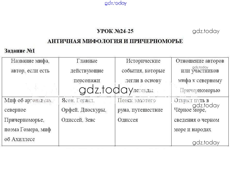 На страницах сайта gdz.today вы найдете учебный и вспомогательный материал, направленный на улучшения знаний школьной программы. ГДЗ - онлайн мир знаний Решение к урокам № 24-25. Античная мифология и Причерноморье 1 Рабочей тетради по Кубановедению для 5 класса Трехбратов Традиция 2019
