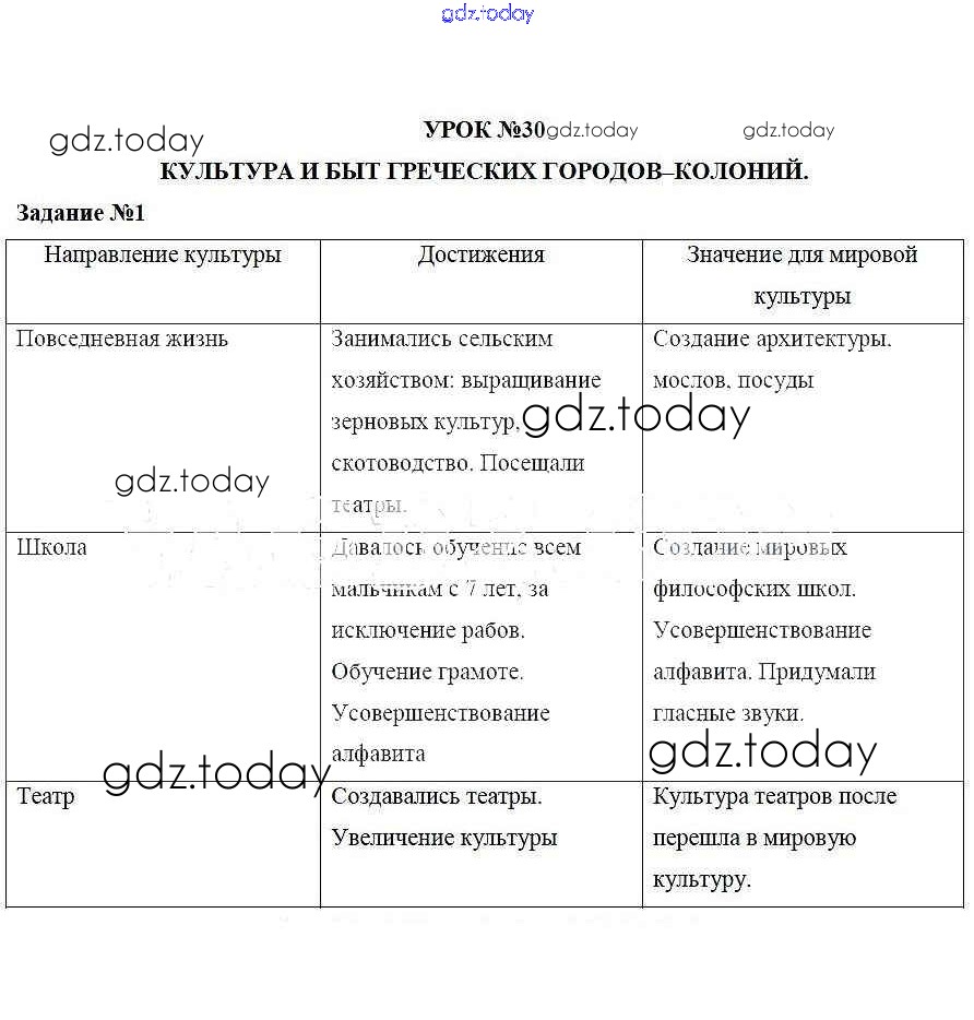 На страницах сайта gdz.today вы найдете учебный и вспомогательный материал, направленный на улучшения знаний школьной программы. ГДЗ - онлайн мир знаний Решение к уроку № 30. Культура и быт греческих городов–колоний 1 Рабочей тетради по Кубановедению для 5 класса Трехбратов Традиция 2019