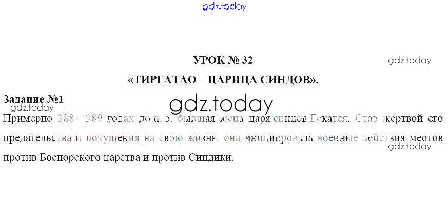 На страницах сайта gdz.today вы найдете учебный и вспомогательный материал, направленный на улучшения знаний школьной программы. ГДЗ - онлайн мир знаний Решение к уроку № 32. Тиргатао – царица Синдов 1 Рабочей тетради по Кубановедению для 5 класса Трехбратов Традиция 2019