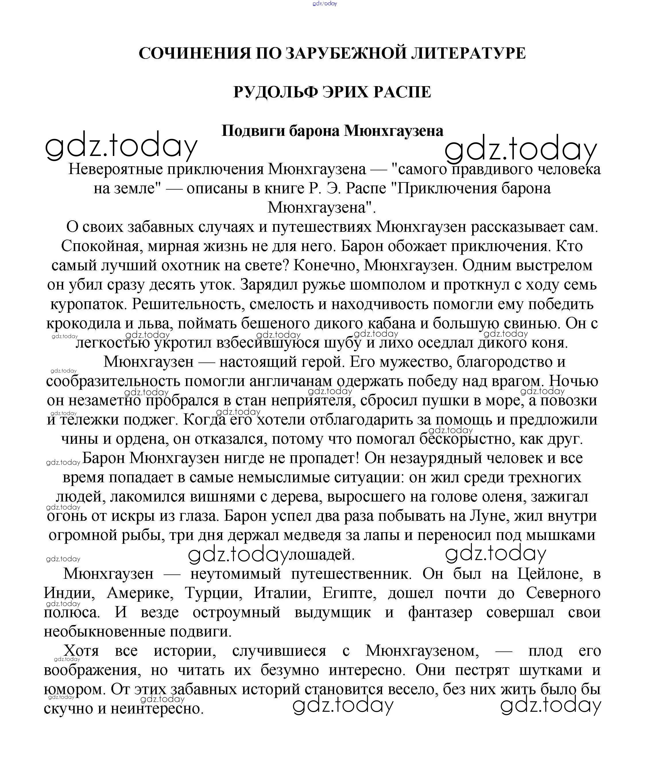 На страницах сайта gdz.today вы найдете учебный и вспомогательный материал, направленный на улучшения знаний школьной программы. ГДЗ - онлайн мир знаний Сочинения по зарубежной литературе 5 класс Подвиги барона Мюнхгаузена Сочинениям по Литературе для 5-10 класса Белик, Музычук Баро-Пресс 2017