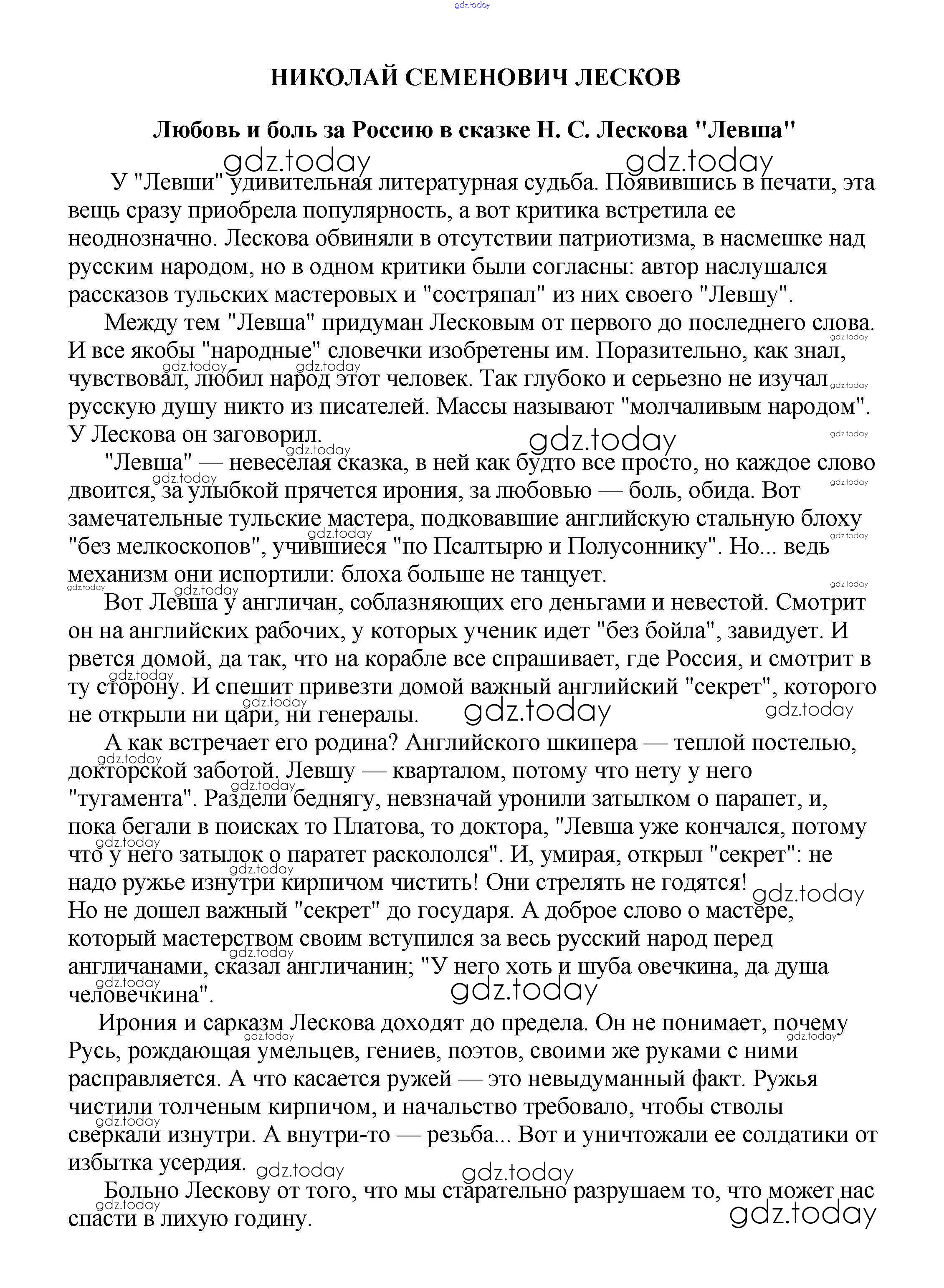 На страницах сайта gdz.today вы найдете учебный и вспомогательный материал, направленный на улучшения знаний школьной программы. ГДЗ - онлайн мир знаний Сочинения по русской литературе 6 класс Любовь и боль за Россию в сказке Н. С. Лескова "Левша" Сочинениям по Литературе для 5-10 класса Белик, Музычук Баро-Пресс 2017