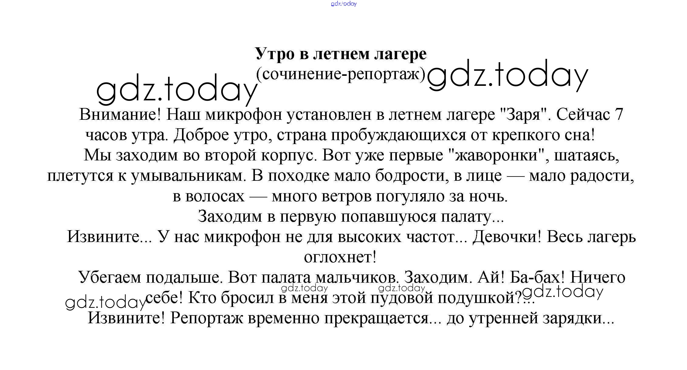 На страницах сайта gdz.today вы найдете учебный и вспомогательный материал, направленный на улучшения знаний школьной программы. ГДЗ - онлайн мир знаний Сочинения на свободную тему 7 класс Утро в летнем лагере (сочинение-репортаж) Сочинениям по Литературе для 5-10 класса Белик, Музычук Баро-Пресс 2017
