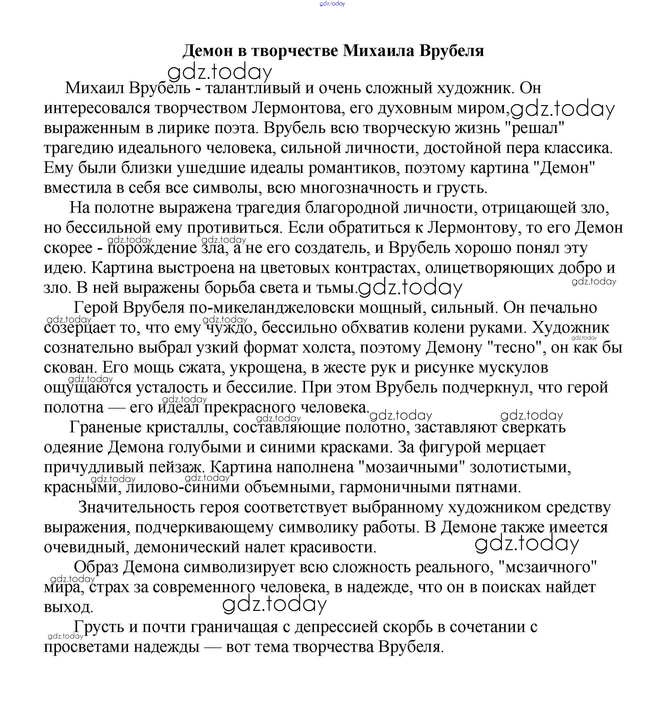 На страницах сайта gdz.today вы найдете учебный и вспомогательный материал, направленный на улучшения знаний школьной программы. ГДЗ - онлайн мир знаний Сочинения на свободную тему 9 класс Демон в творчестве Михаила Врубеля Сочинениям по Литературе для 5-10 класса Белик, Музычук Баро-Пресс 2017