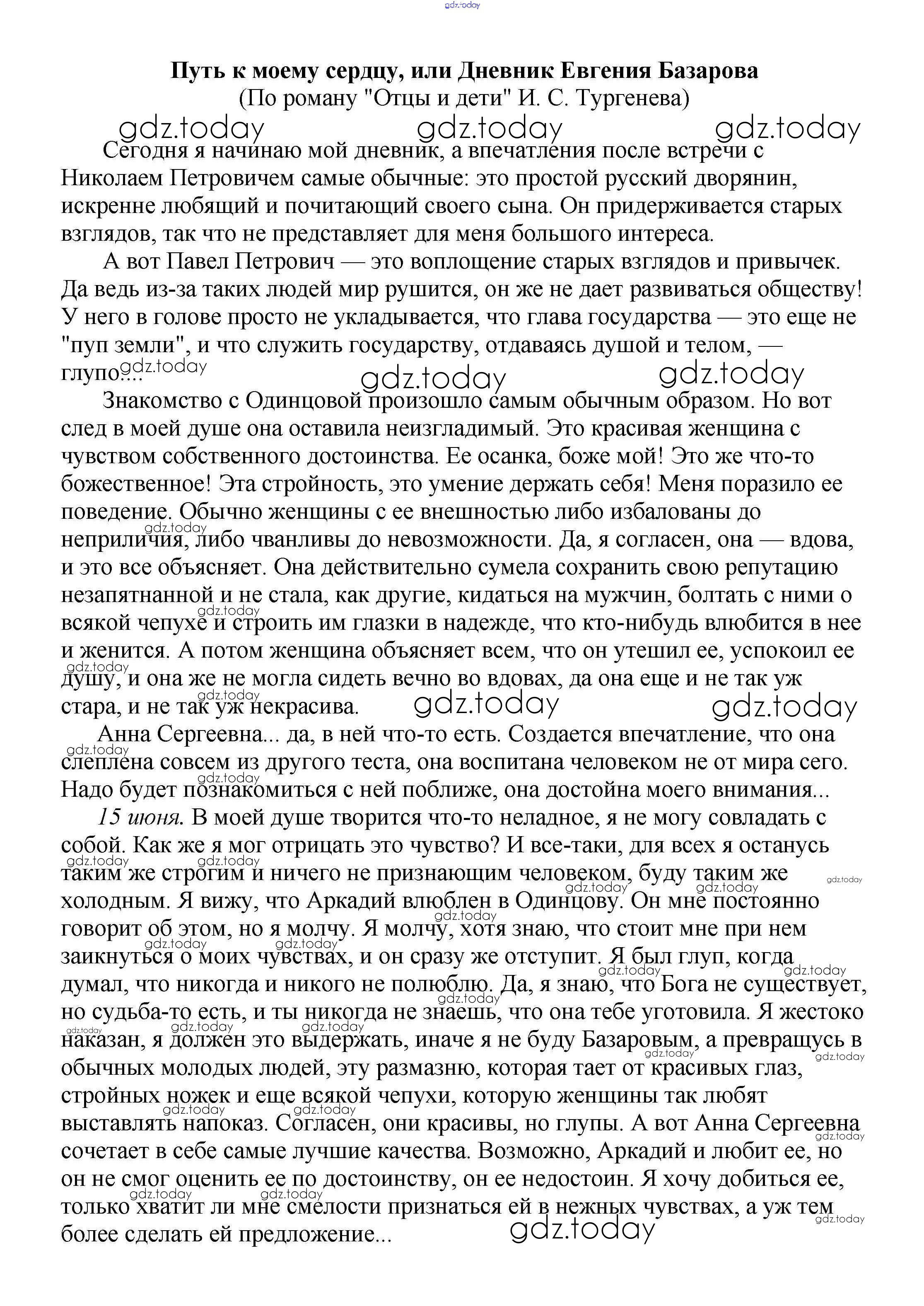 На страницах сайта gdz.today вы найдете учебный и вспомогательный материал, направленный на улучшения знаний школьной программы. ГДЗ - онлайн мир знаний Сочинения по русской литературе 10 класс Путь к моему сердцу, или Дневник Евгения Базарова (По роману "Отцы и дети" И. С. Тургенева) Сочинениям по Литературе для 5-10 класса Белик, Музычук Баро-Пресс 2017