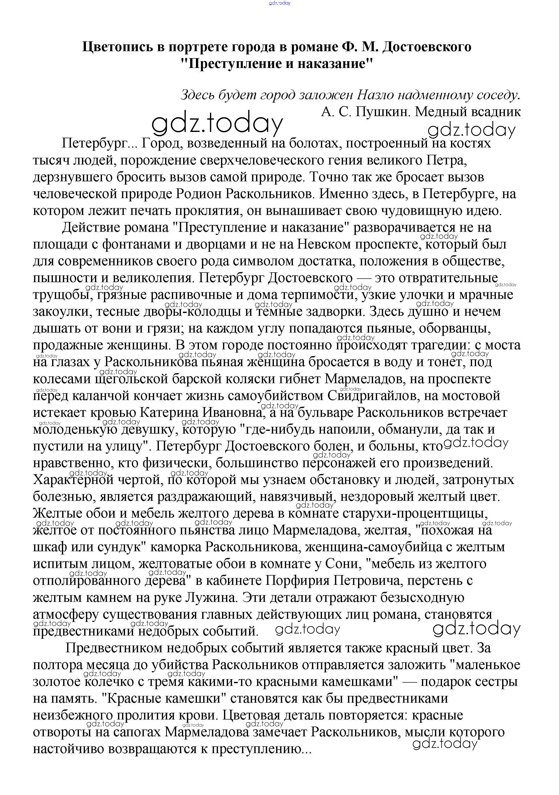 На страницах сайта gdz.today вы найдете учебный и вспомогательный материал, направленный на улучшения знаний школьной программы. ГДЗ - онлайн мир знаний Сочинения по русской литературе 10 класс Цветопись в портрете города в романе Ф. М. Достоевского "Преступление и наказание" Сочинениям по Литературе для 5-10 класса Белик, Музычук Баро-Пресс 2017