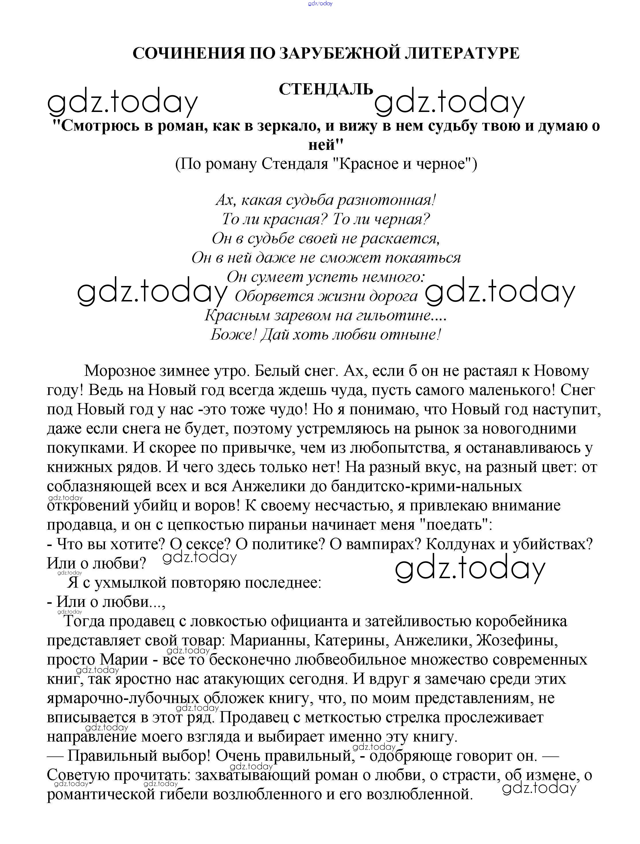 На страницах сайта gdz.today вы найдете учебный и вспомогательный материал, направленный на улучшения знаний школьной программы. ГДЗ - онлайн мир знаний Сочинения по зарубежной литературе 10 класс "Смотрюсь в роман, как в зеркало, и вижу в нем судьбу твою и думаю о ней" (По роману Стендаля "Красное и черное") Сочинениям по Литературе для 5-10 класса Белик, Музычук Баро-Пресс 2017