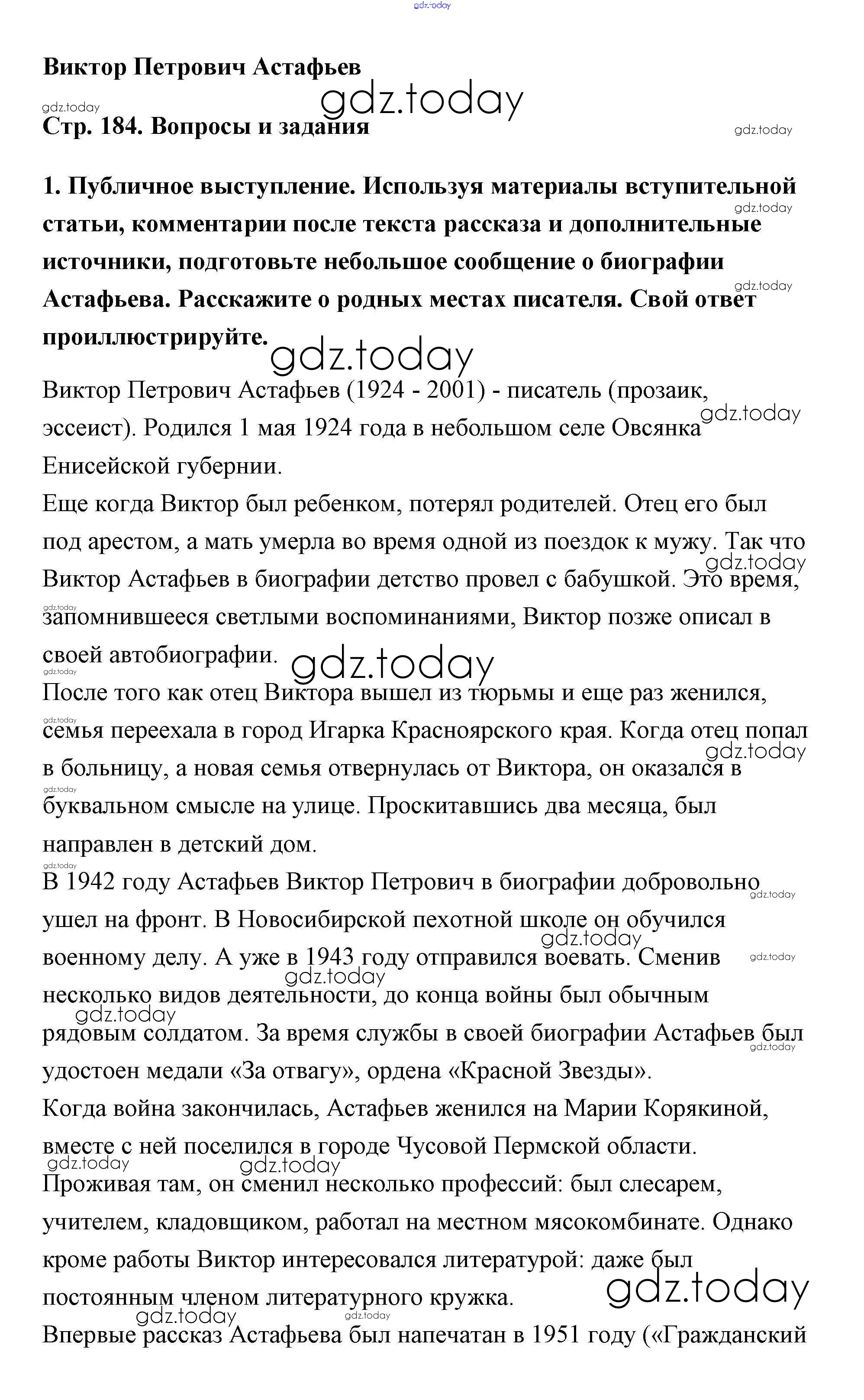 На страницах сайта gdz.today вы найдете учебный и вспомогательный материал, направленный на улучшения знаний школьной программы. ГДЗ - онлайн мир знаний В.П. Астафьев Решение к части 2 (Темы) страница 184 Учебнику по Литературе для 5 класса Чертов, Трубина Просвещение 2018