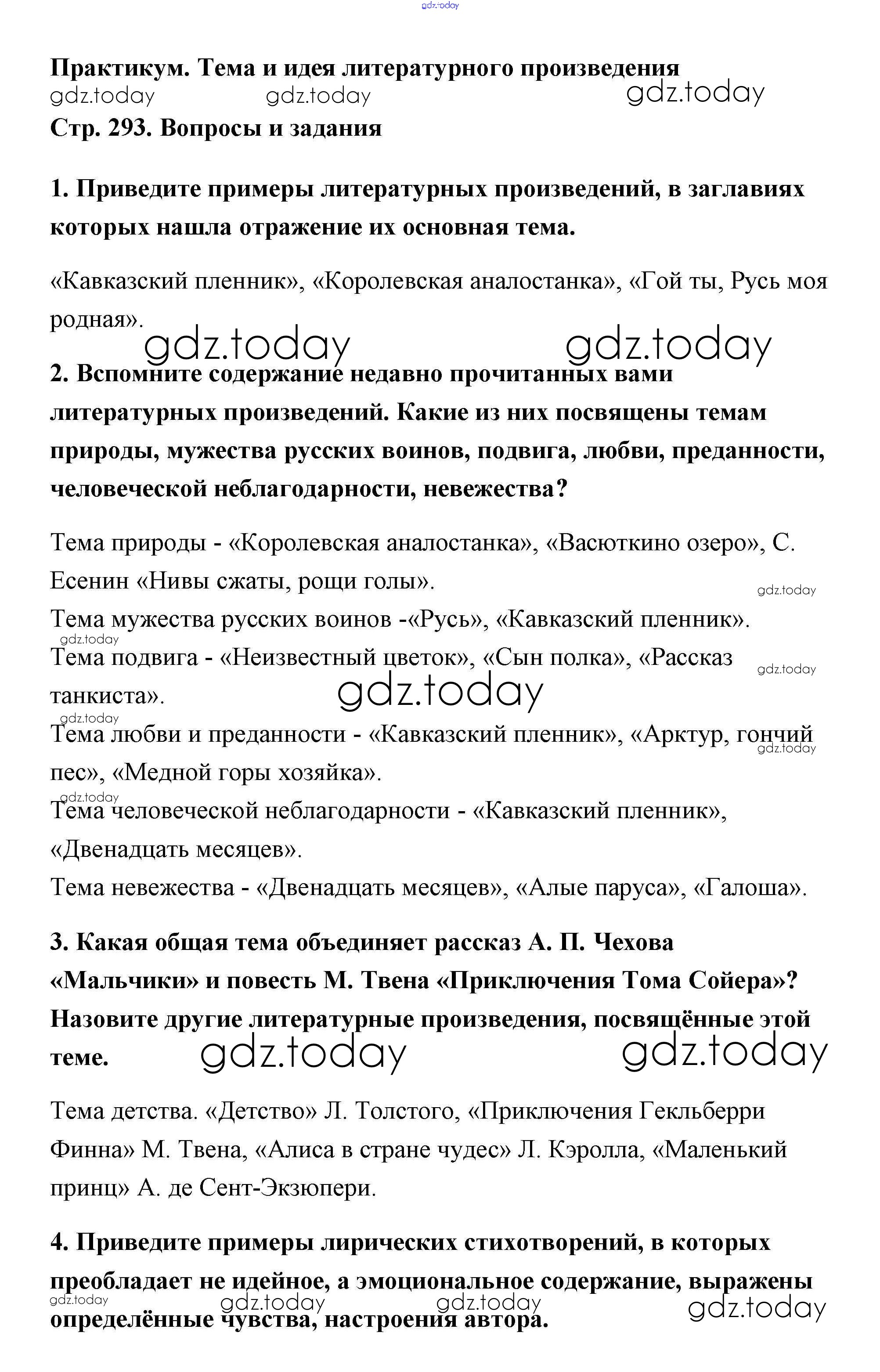 На страницах сайта gdz.today вы найдете учебный и вспомогательный материал, направленный на улучшения знаний школьной программы. ГДЗ - онлайн мир знаний Практикум. Тема и идея Решение к части 2 (Темы) страница 293 Учебнику по Литературе для 5 класса Чертов, Трубина Просвещение 2018