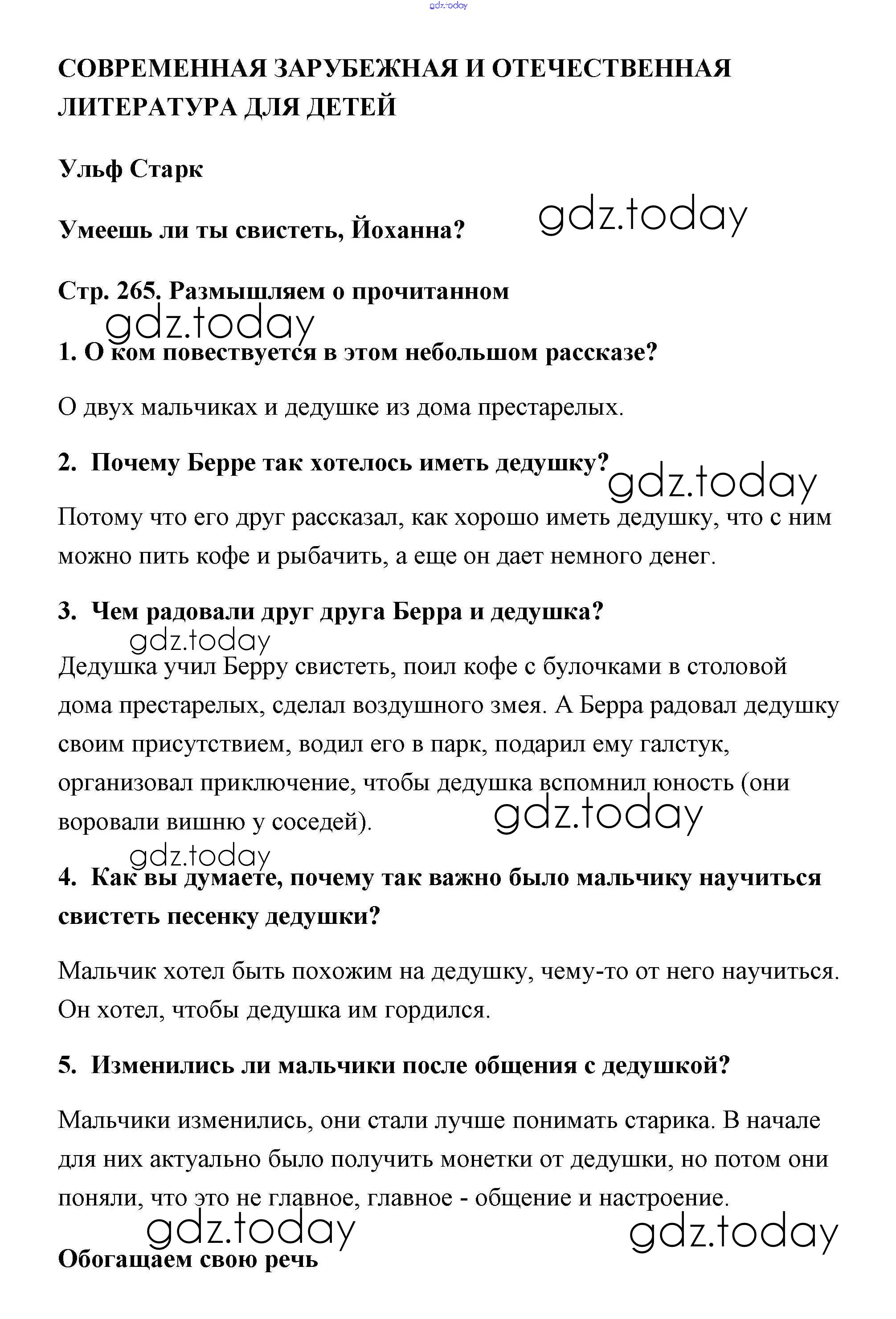На страницах сайта gdz.today вы найдете учебный и вспомогательный материал, направленный на улучшения знаний школьной программы. ГДЗ - онлайн мир знаний Старк (Страницы) Решение к части 2 (Темы) 265 Учебнику по Литературе для 5 класса Коровина, Коровин Просвещение 2016