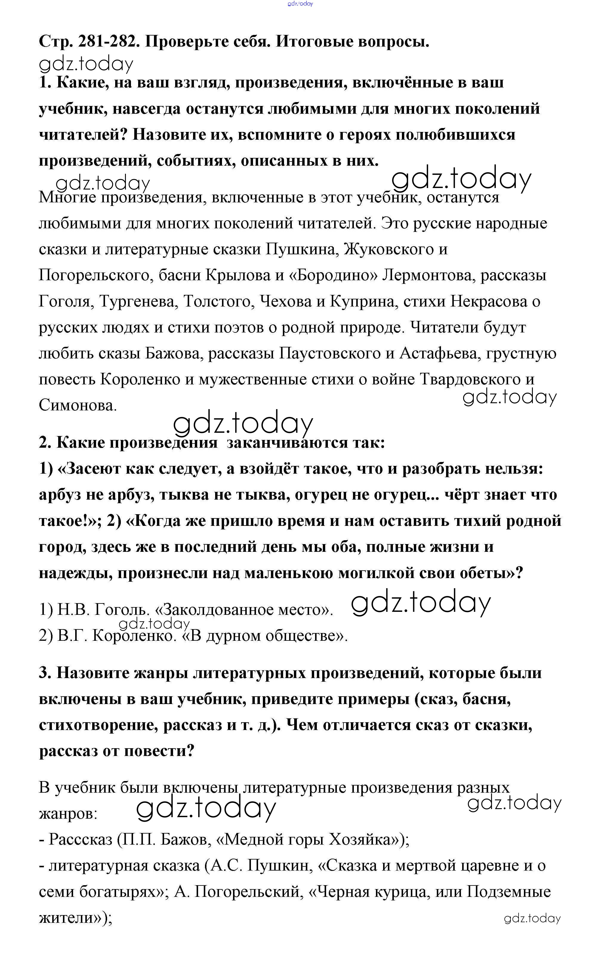 На страницах сайта gdz.today вы найдете учебный и вспомогательный материал, направленный на улучшения знаний школьной программы. ГДЗ - онлайн мир знаний Итоговые вопросы (Страницы) Решение к части 2 (Темы) 281 Учебнику по Литературе для 5 класса Коровина, Коровин Просвещение 2016
