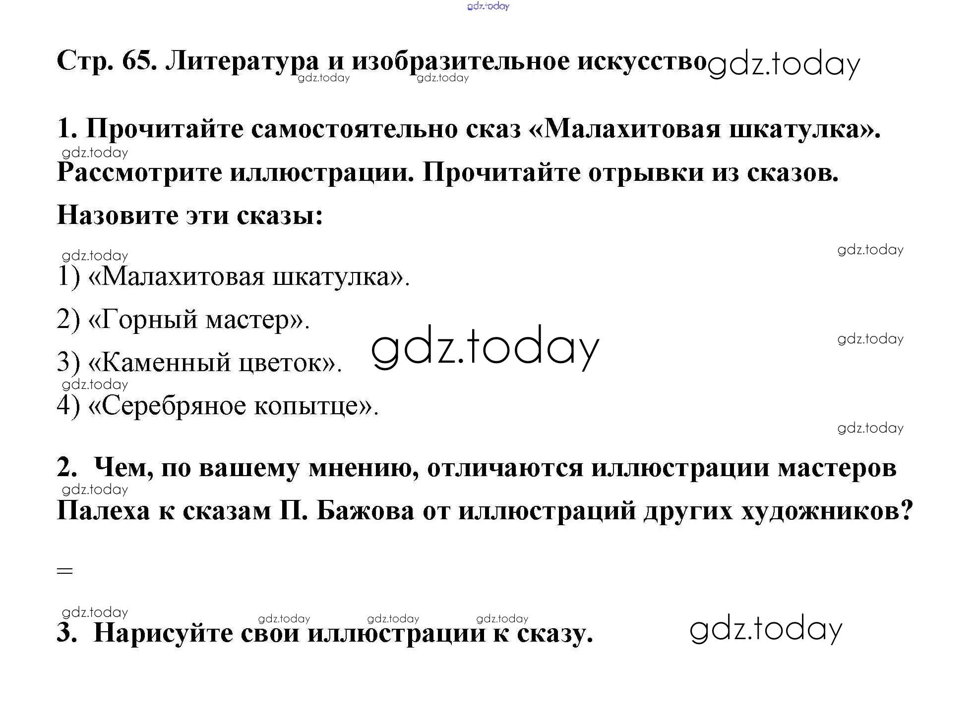 На страницах сайта gdz.today вы найдете учебный и вспомогательный материал, направленный на улучшения знаний школьной программы. ГДЗ - онлайн мир знаний Бажов (Страницы) Решение к части 2 (Темы) 65 Учебнику по Литературе для 5 класса Коровина, Коровин Просвещение 2016