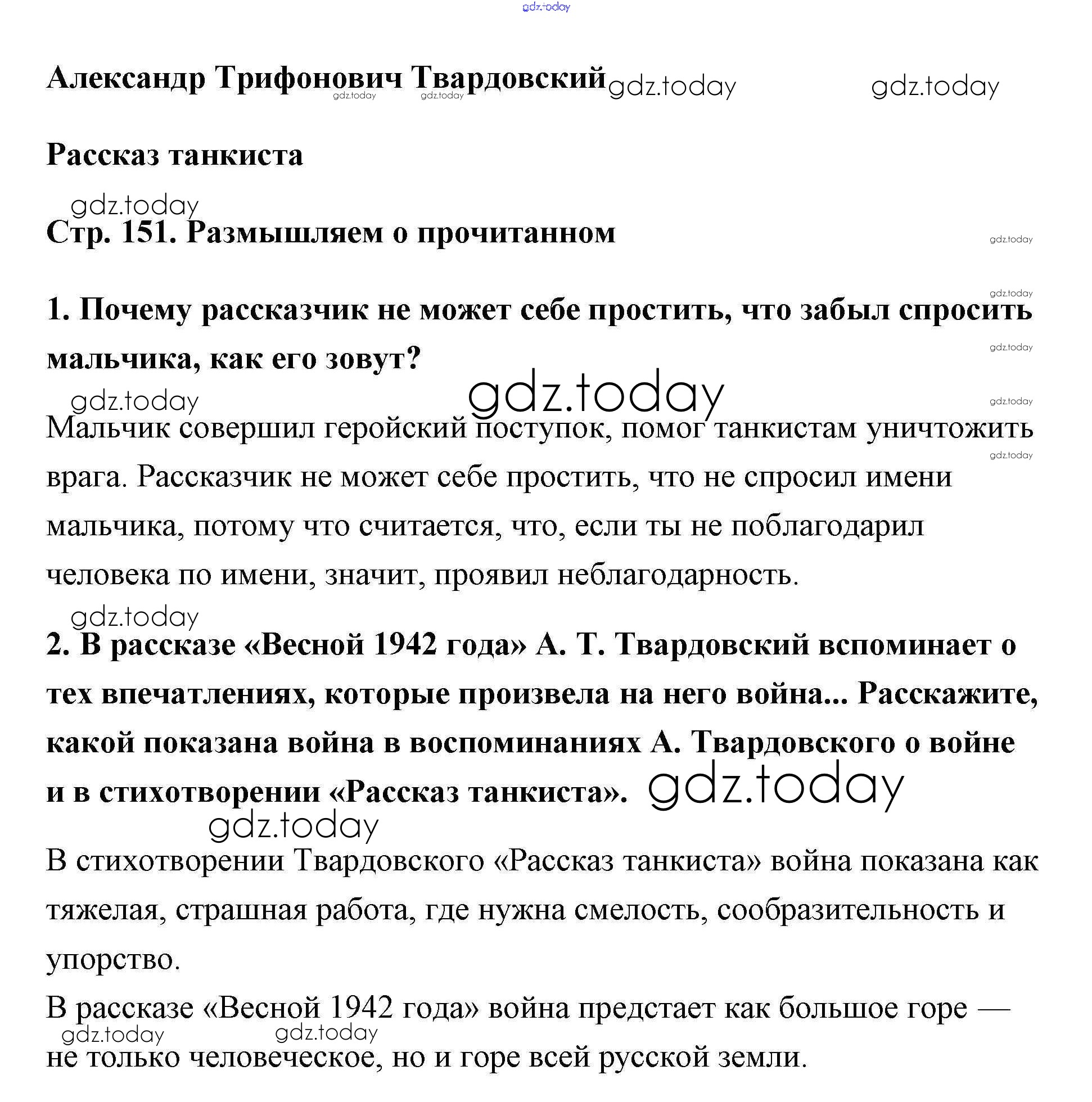 На страницах сайта gdz.today вы найдете учебный и вспомогательный материал, направленный на улучшения знаний школьной программы. ГДЗ - онлайн мир знаний Твардовский (Страницы) Решение к части 2 (Темы) 151 Учебнику по Литературе для 5 класса Коровина, Коровин Просвещение 2016