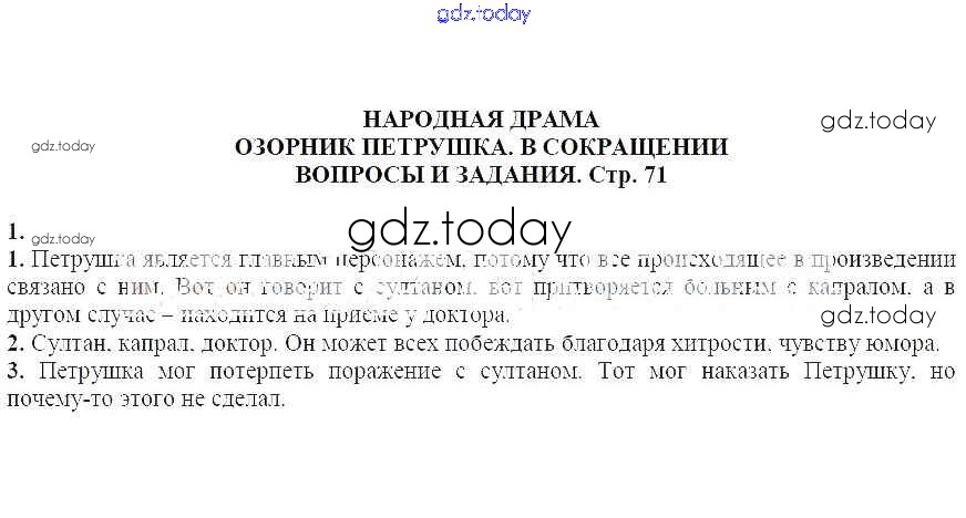 На страницах сайта gdz.today вы найдете учебный и вспомогательный материал, направленный на улучшения знаний школьной программы. ГДЗ - онлайн мир знаний Вопросы и задания на стр. 71 Решение к части 1 1 Учебнику-хрестоматии по Литературе для 5 класса Курдюмова Дрофа Вертикаль 2016