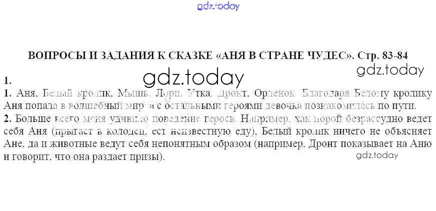 На страницах сайта gdz.today вы найдете учебный и вспомогательный материал, направленный на улучшения знаний школьной программы. ГДЗ - онлайн мир знаний Вопросы и задания на стр. 83-84 Решение к части 2 1 Учебнику-хрестоматии по Литературе для 5 класса Курдюмова Дрофа Вертикаль 2016