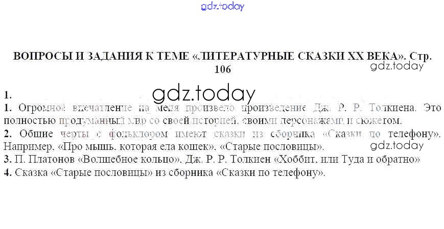 На страницах сайта gdz.today вы найдете учебный и вспомогательный материал, направленный на улучшения знаний школьной программы. ГДЗ - онлайн мир знаний Вопросы и задания на стр. 106 Решение к части 2 1 Учебнику-хрестоматии по Литературе для 5 класса Курдюмова Дрофа Вертикаль 2016