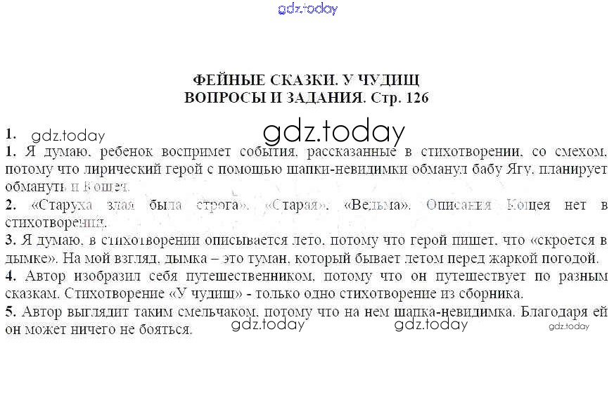 На страницах сайта gdz.today вы найдете учебный и вспомогательный материал, направленный на улучшения знаний школьной программы. ГДЗ - онлайн мир знаний Вопросы и задания на стр. 126 Решение к части 2 1 Учебнику-хрестоматии по Литературе для 5 класса Курдюмова Дрофа Вертикаль 2016