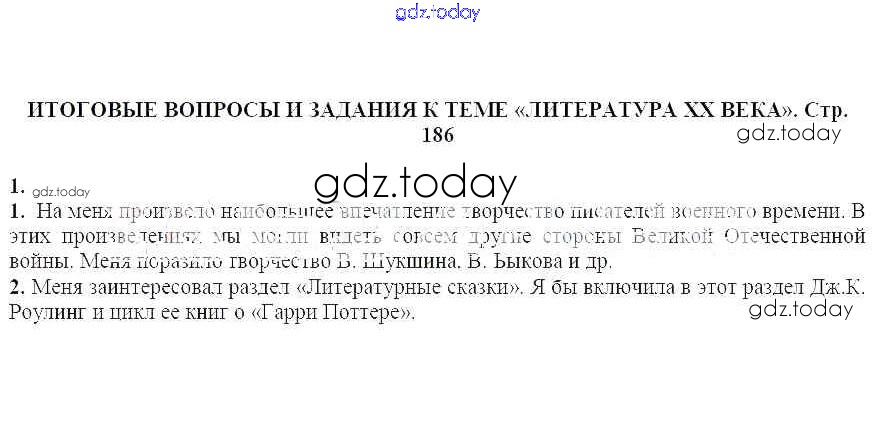На страницах сайта gdz.today вы найдете учебный и вспомогательный материал, направленный на улучшения знаний школьной программы. ГДЗ - онлайн мир знаний Итоговые вопросы и задания на стр. 186 Решение к части 2 1 Учебнику-хрестоматии по Литературе для 5 класса Курдюмова Дрофа Вертикаль 2016