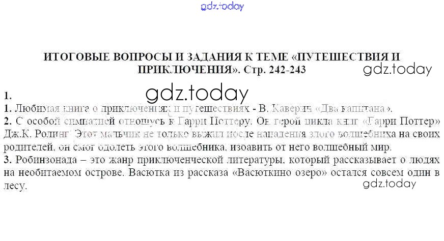 На страницах сайта gdz.today вы найдете учебный и вспомогательный материал, направленный на улучшения знаний школьной программы. ГДЗ - онлайн мир знаний Итоговые вопросы и задания на стр. 242-243 Решение к части 2 1 Учебнику-хрестоматии по Литературе для 5 класса Курдюмова Дрофа Вертикаль 2016