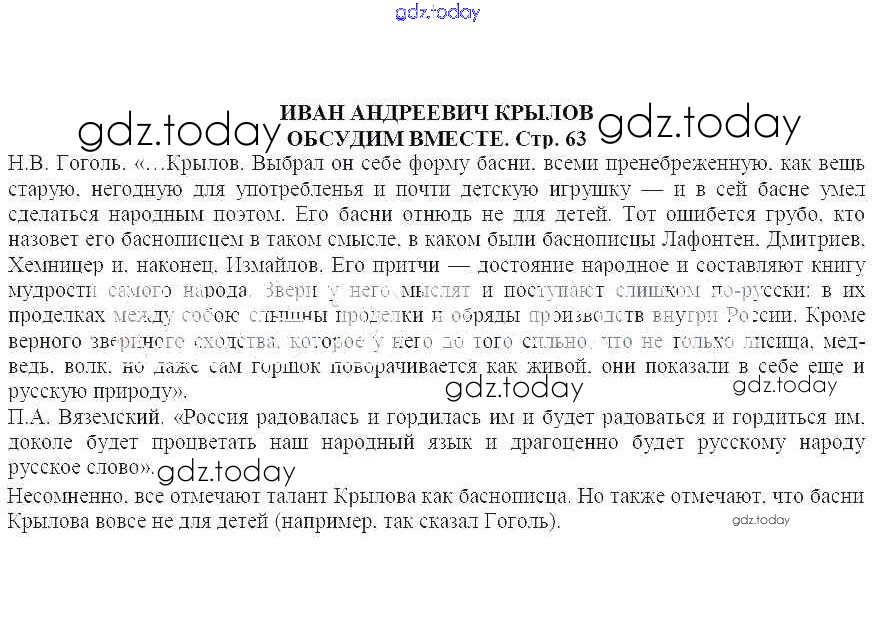На страницах сайта gdz.today вы найдете учебный и вспомогательный материал, направленный на улучшения знаний школьной программы. ГДЗ - онлайн мир знаний Иван Андреевич Крылов Решение к части 1 Обсудим вместе (стр.63) Учебнику по Литературе для 5 класса Ланин, Устинова Вентана-граф 2016