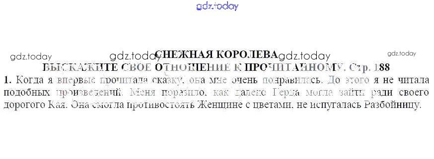 На страницах сайта gdz.today вы найдете учебный и вспомогательный материал, направленный на улучшения знаний школьной программы. ГДЗ - онлайн мир знаний Выскажите свое отношение к прочитанному (стр.188) Снежная Королева 1 Учебнику по Литературе для 5 класса Ланин, Устинова Вентана-граф 2016