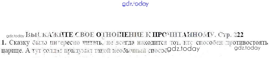 На страницах сайта gdz.today вы найдете учебный и вспомогательный материал, направленный на улучшения знаний школьной программы. ГДЗ - онлайн мир знаний Выскажите свое отношение к прочитанному (стр.222) Андрей Платонович Платонов. Солдат и царица. Сказка-быль 1 Учебнику по Литературе для 5 класса Ланин, Устинова Вентана-граф 2016