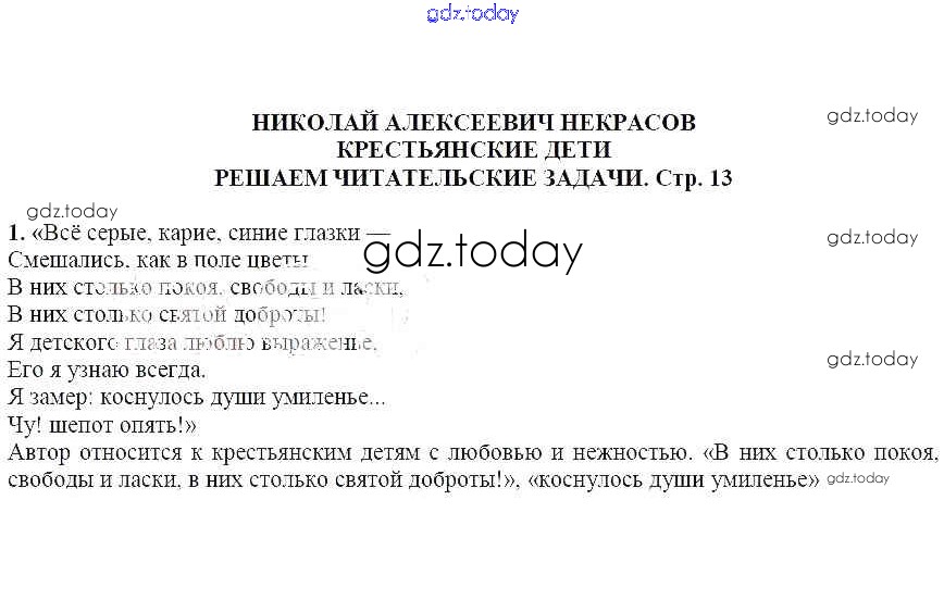 На страницах сайта gdz.today вы найдете учебный и вспомогательный материал, направленный на улучшения знаний школьной программы. ГДЗ - онлайн мир знаний Решаем читательские задачи (стр.13) Николай Алексеевич Некрасов Крестьянские дети 1 Учебнику по Литературе для 5 класса Ланин, Устинова Вентана-граф 2016