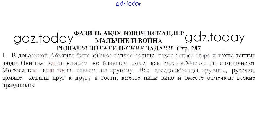На страницах сайта gdz.today вы найдете учебный и вспомогательный материал, направленный на улучшения знаний школьной программы. ГДЗ - онлайн мир знаний Решаем читательские задачи (стр.287) Фазиль Абдулович Искандер. Мальчик и война 1 Учебнику по Литературе для 5 класса Ланин, Устинова Вентана-граф 2016