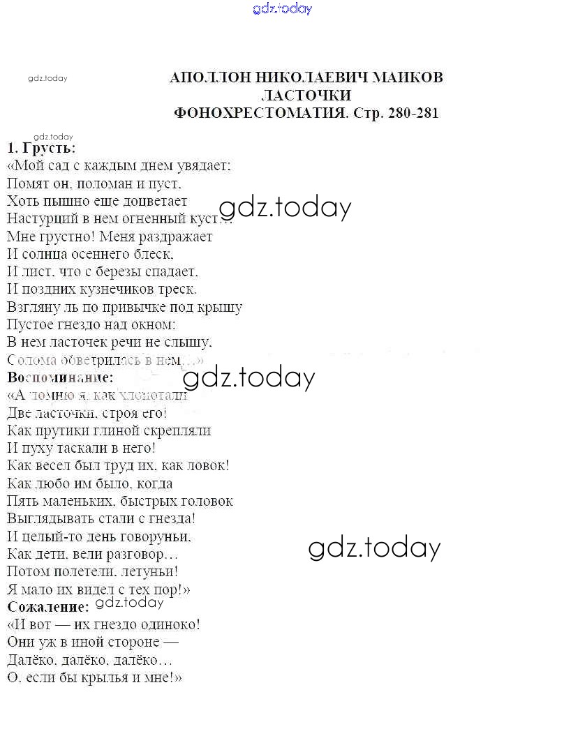 На страницах сайта gdz.today вы найдете учебный и вспомогательный материал, направленный на улучшения знаний школьной программы. ГДЗ - онлайн мир знаний Решение к части 1 (Страницы) 280 Учебнику по Литературе для 5 класса Коровина, Журавлев Просвещение 2019