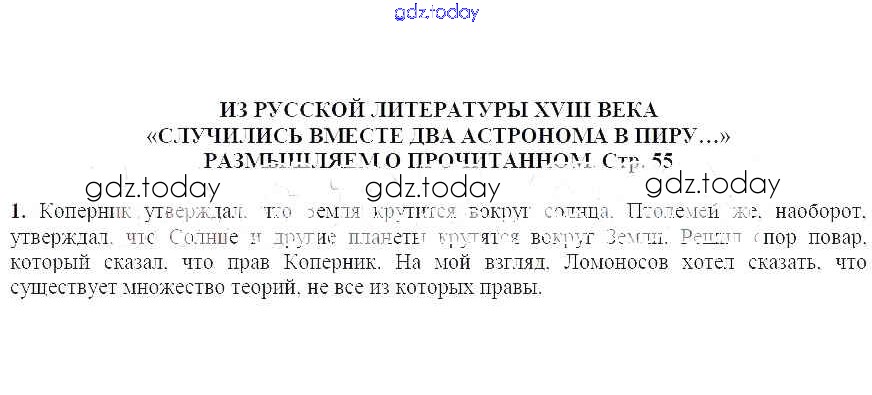 На страницах сайта gdz.today вы найдете учебный и вспомогательный материал, направленный на улучшения знаний школьной программы. ГДЗ - онлайн мир знаний Решение к части 1 (Страницы) 55 Учебнику по Литературе для 5 класса Коровина, Журавлев Просвещение 2019