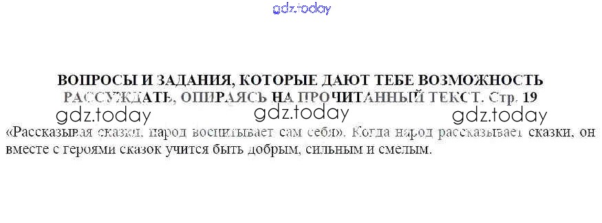 На страницах сайта gdz.today вы найдете учебный и вспомогательный материал, направленный на улучшения знаний школьной программы. ГДЗ - онлайн мир знаний Русские народные сказки Решение к части 1 Вопросы и задания, которые дают тебе возможность рассуждать, опираясь на прочитанный текст (стр. 19) Учебнику по Литературе для 5 класса Москвин Вентана-граф Алгоритм успеха 2020