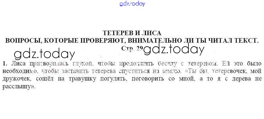 На страницах сайта gdz.today вы найдете учебный и вспомогательный материал, направленный на улучшения знаний школьной программы. ГДЗ - онлайн мир знаний Вопросы, которые проверяют, внимательно ли ты читал текст (стр. 29) Тетерев и лиса 1 Учебнику по Литературе для 5 класса Москвин Вентана-граф Алгоритм успеха 2020