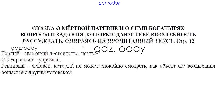 На страницах сайта gdz.today вы найдете учебный и вспомогательный материал, направленный на улучшения знаний школьной программы. ГДЗ - онлайн мир знаний Сказка о мёртвой царевне и о семи богатырях А.С. Пушкина Решение к части 1 Вопросы и задания, которые дают тебе возможность рассуждать, опираясь на прочитанный текст (стр. 42) Учебнику по Литературе для 5 класса Москвин Вентана-граф Алгоритм успеха 2020