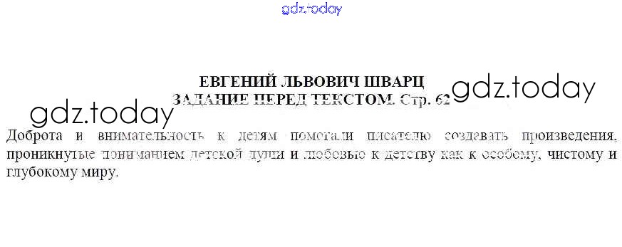 На страницах сайта gdz.today вы найдете учебный и вспомогательный материал, направленный на улучшения знаний школьной программы. ГДЗ - онлайн мир знаний Евгений Львович Шварц Решение к части 1 Задания перед текстом (стр.62) Учебнику по Литературе для 5 класса Москвин Вентана-граф Алгоритм успеха 2020