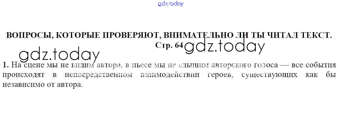 На страницах сайта gdz.today вы найдете учебный и вспомогательный материал, направленный на улучшения знаний школьной программы. ГДЗ - онлайн мир знаний Вопросы, которые проверяют, внимательно ли ты читал текст (стр. 64) Что такое пьеса 1 Учебнику по Литературе для 5 класса Москвин Вентана-граф Алгоритм успеха 2020