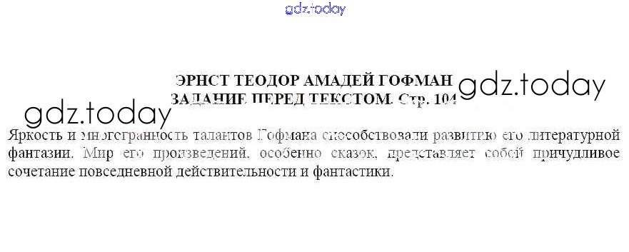 На страницах сайта gdz.today вы найдете учебный и вспомогательный материал, направленный на улучшения знаний школьной программы. ГДЗ - онлайн мир знаний Эрнст Теодор Амадей Гофман Решение к части 1 Задание перед текстом (стр.104) Учебнику по Литературе для 5 класса Москвин Вентана-граф Алгоритм успеха 2020