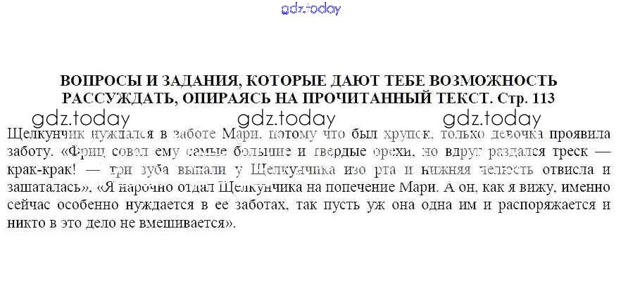 На страницах сайта gdz.today вы найдете учебный и вспомогательный материал, направленный на улучшения знаний школьной программы. ГДЗ - онлайн мир знаний Щелкунчик и мышиный король Решение к части 1 Вопросы и задания, которые дают тебе возможность рассуждать, опираясь на прочитанный текст (стр. 113) Учебнику по Литературе для 5 класса Москвин Вентана-граф Алгоритм успеха 2020