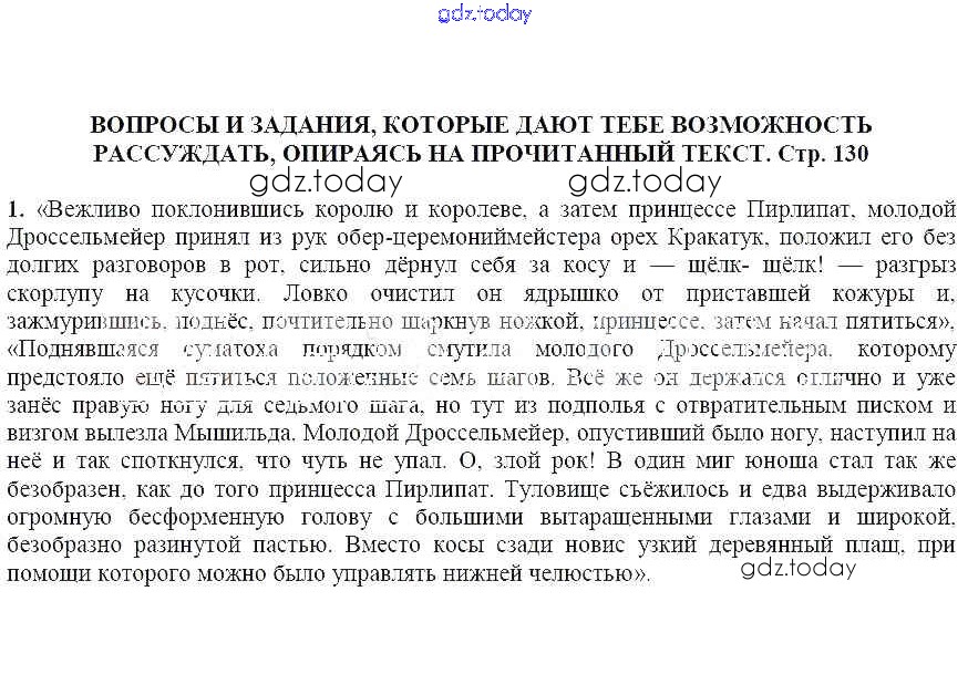 На страницах сайта gdz.today вы найдете учебный и вспомогательный материал, направленный на улучшения знаний школьной программы. ГДЗ - онлайн мир знаний Вопросы и задания, которые дают тебе возможность рассуждать, опираясь на прочитанный текст (стр. 130) Щелкунчик и мышиный король 1 Учебнику по Литературе для 5 класса Москвин Вентана-граф Алгоритм успеха 2020