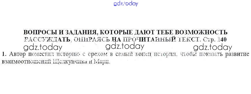 На страницах сайта gdz.today вы найдете учебный и вспомогательный материал, направленный на улучшения знаний школьной программы. ГДЗ - онлайн мир знаний Вопросы и задания, которые дают тебе возможность рассуждать, опираясь на прочитанный текст (стр. 140) Щелкунчик и мышиный король 1 Учебнику по Литературе для 5 класса Москвин Вентана-граф Алгоритм успеха 2020