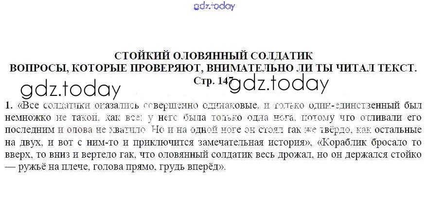 На страницах сайта gdz.today вы найдете учебный и вспомогательный материал, направленный на улучшения знаний школьной программы. ГДЗ - онлайн мир знаний Вопросы, которые проверяют, внимательно ли ты читал текст (стр. 147) Стойкий оловянный солдатик 1 Учебнику по Литературе для 5 класса Москвин Вентана-граф Алгоритм успеха 2020