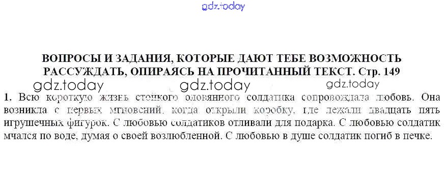 На страницах сайта gdz.today вы найдете учебный и вспомогательный материал, направленный на улучшения знаний школьной программы. ГДЗ - онлайн мир знаний Вопросы и задания, которые дают тебе возможность рассуждать, опираясь на прочитанный текст (стр. 149) Стойкий оловянный солдатик 1 Учебнику по Литературе для 5 класса Москвин Вентана-граф Алгоритм успеха 2020
