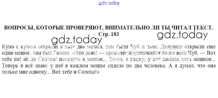 На страницах сайта gdz.today вы найдете учебный и вспомогательный материал, направленный на улучшения знаний школьной программы. ГДЗ - онлайн мир знаний Ночь перед Рождеством Решение к части 1 Вопросы, которые проверяют, внимательно ли ты читал текст (стр. 183) Учебнику по Литературе для 5 класса Москвин Вентана-граф Алгоритм успеха 2020