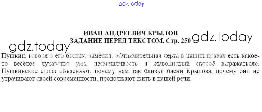 На страницах сайта gdz.today вы найдете учебный и вспомогательный материал, направленный на улучшения знаний школьной программы. ГДЗ - онлайн мир знаний Иван Андреевич Крылов Решение к части 1 Задание перед текстом (стр. 250) Учебнику по Литературе для 5 класса Москвин Вентана-граф Алгоритм успеха 2020