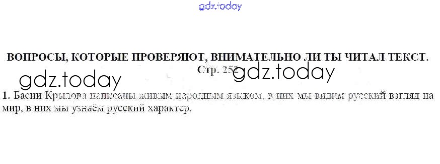 На страницах сайта gdz.today вы найдете учебный и вспомогательный материал, направленный на улучшения знаний школьной программы. ГДЗ - онлайн мир знаний Вопросы, которые проверяют, внимательно ли ты читал текст (стр. 252) Иван Андреевич Крылов 1 Учебнику по Литературе для 5 класса Москвин Вентана-граф Алгоритм успеха 2020