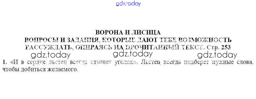 На страницах сайта gdz.today вы найдете учебный и вспомогательный материал, направленный на улучшения знаний школьной программы. ГДЗ - онлайн мир знаний Вопросы и задания, которые дают тебе возможность рассуждать, опираясь на прочитанный текст (стр. 253) Ворона и лисица 1 Учебнику по Литературе для 5 класса Москвин Вентана-граф Алгоритм успеха 2020