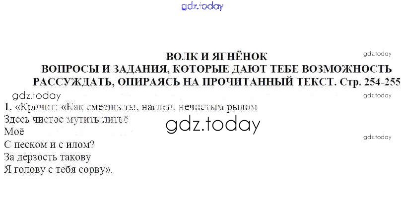 На страницах сайта gdz.today вы найдете учебный и вспомогательный материал, направленный на улучшения знаний школьной программы. ГДЗ - онлайн мир знаний Вопросы и задания, которые дают тебе возможность рассуждать, опираясь на прочитанный текст (стр. 254-255) Волк и ягненок 1 Учебнику по Литературе для 5 класса Москвин Вентана-граф Алгоритм успеха 2020