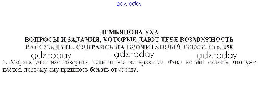 На страницах сайта gdz.today вы найдете учебный и вспомогательный материал, направленный на улучшения знаний школьной программы. ГДЗ - онлайн мир знаний Вопросы и задания, которые дают тебе возможность рассуждать, опираясь на прочитанный текст (стр. 258) Демьянова уха 1 Учебнику по Литературе для 5 класса Москвин Вентана-граф Алгоритм успеха 2020