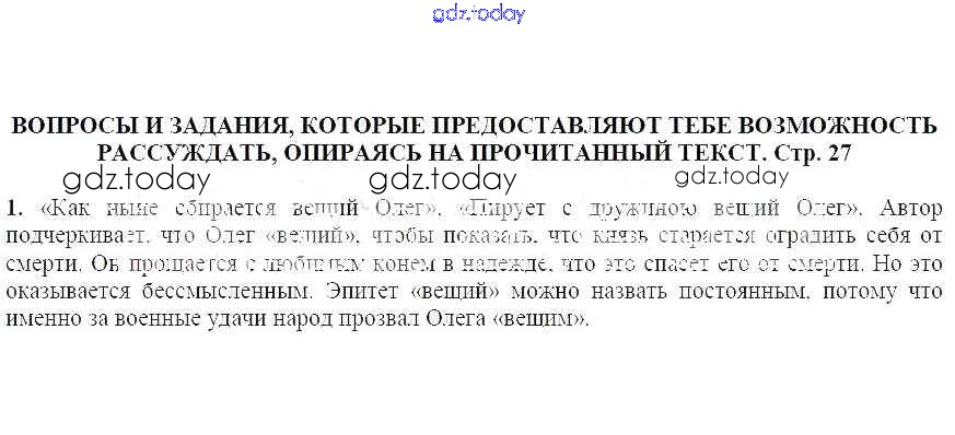 На страницах сайта gdz.today вы найдете учебный и вспомогательный материал, направленный на улучшения знаний школьной программы. ГДЗ - онлайн мир знаний Вопросы и задания, которые дают тебе возможность рассуждать, опираясь на прочитанный текст (стр. 27) Песнь о вещем Олеге 1 Учебнику по Литературе для 5 класса Москвин Вентана-граф Алгоритм успеха 2020